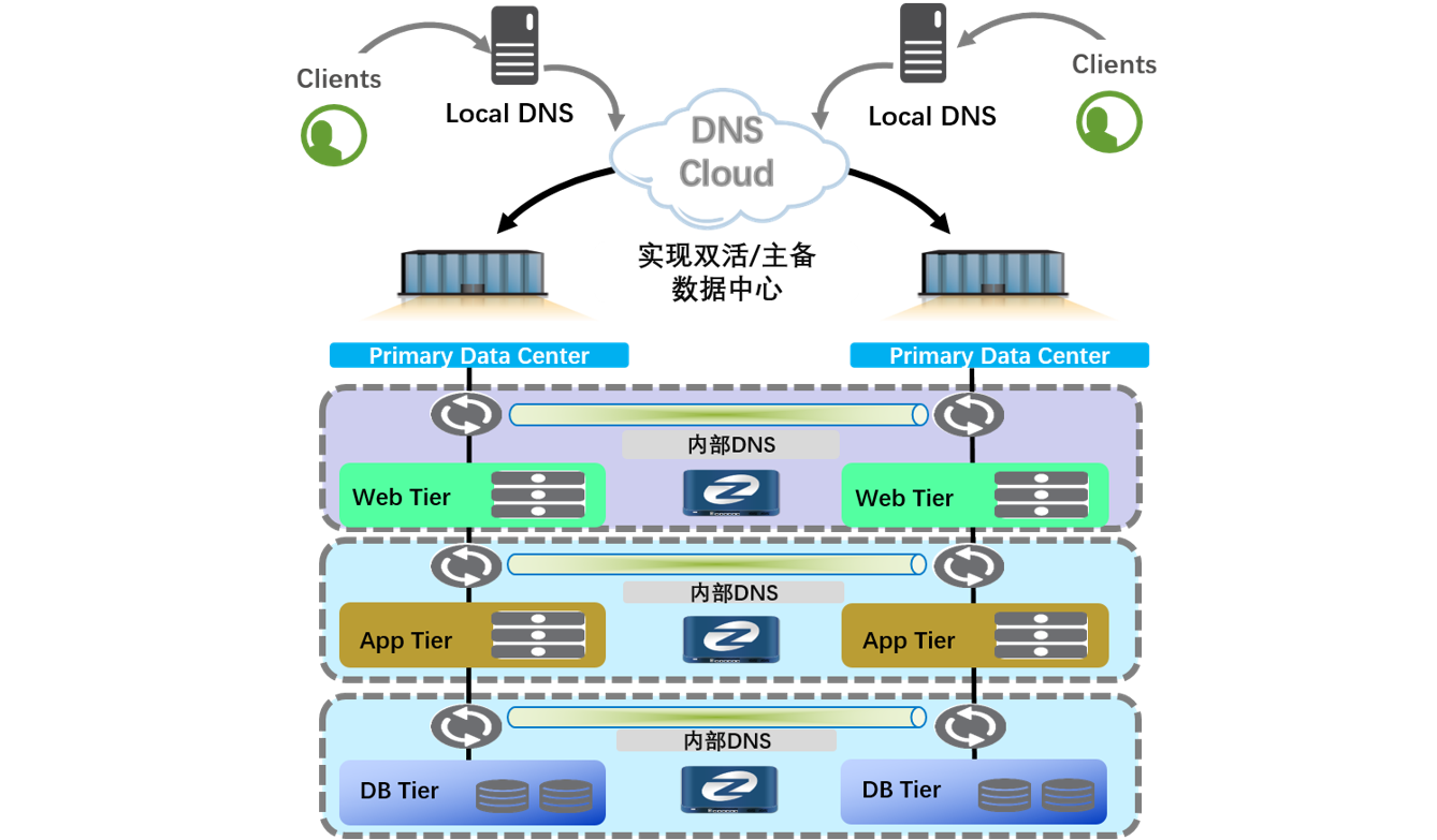 数据中心为提高应用系统的可靠性,实现多站点资源分布式部署,提高资源的利用率,需要多站点的应用系统构建成多活或主备工作模式。为了与IP地址解耦,通常会使用域名系统(DNS)来调度这些应用。森林舞会多数据中心域名(DNS)解决方案以IT整体架构为蓝图,以业务陆续在性保障为目标,利用域名解析门户应用调度功能,可将用户访问流量引流到可靠、可用的数据中心进行访问,既能保证用户的使用体验,又能达到应用容灾的无感切换的目的。